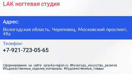 LAK, ногтевая студия по адресу Вологодская область, Череповец, Московский проспект, 49а в дальнейшем Организация, размещена в следующих категориях: