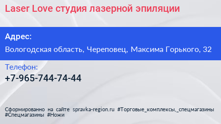 Laser Love, студия лазерной эпиляции по адресу Вологодская область, Череповец, Максима Горького, 32 в дальнейшем Организация, размещена в следующих категориях: