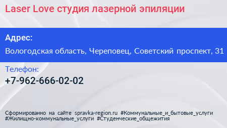 Laser Love, студия лазерной эпиляции по адресу Вологодская область, Череповец, Советский проспект, 31 в дальнейшем Организация, размещена в следующих категориях:
