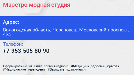 Маэстро, модная студия по адресу Вологодская область, Череповец, Московский проспект, 49а в дальнейшем Организация, размещена в следующих категориях: