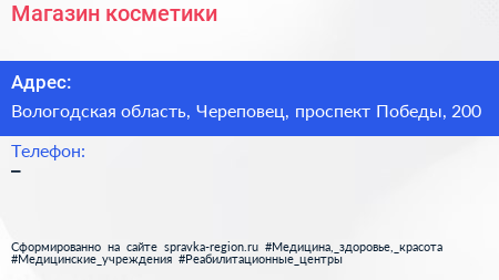 Магазин косметики по адресу Вологодская область, Череповец, проспект Победы, 200 в дальнейшем Организация, размещена в следующих категориях: