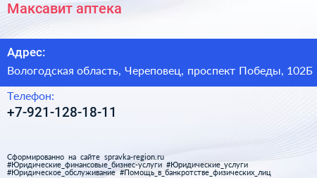 Максавит, аптека по адресу Вологодская область, Череповец, проспект Победы, 102Б в дальнейшем Организация, размещена в следующих категориях: