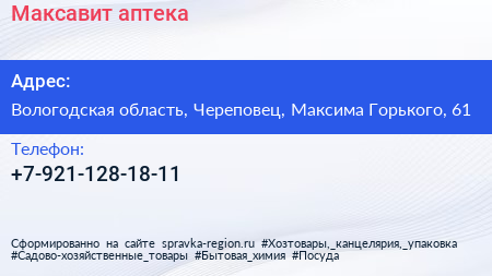 Максавит, аптека по адресу Вологодская область, Череповец, Максима Горького, 61 в дальнейшем Организация, размещена в следующих категориях: