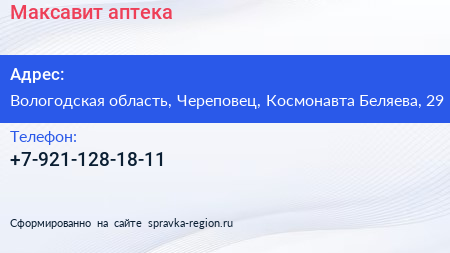Максавит, аптека по адресу Вологодская область, Череповец, Космонавта Беляева, 29 в дальнейшем Организация, размещена в следующих категориях: