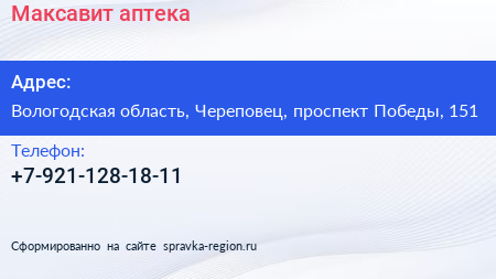 Максавит, аптека по адресу Вологодская область, Череповец, проспект Победы, 151 в дальнейшем Организация, размещена в следующих категориях: