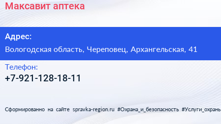 Максавит, аптека по адресу Вологодская область, Череповец, Архангельская, 41 в дальнейшем Организация, размещена в следующих категориях: