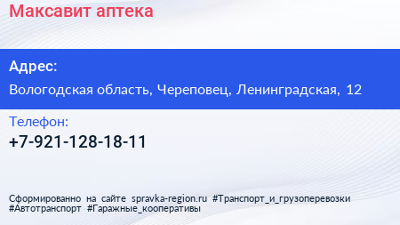 Максавит, аптека по адресу Вологодская область, Череповец, Ленинградская, 12 в дальнейшем Организация, размещена в следующих категориях: