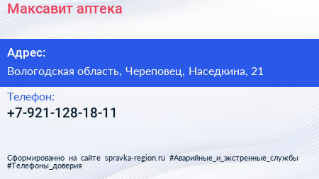 Максавит, аптека по адресу Вологодская область, Череповец, Наседкина, 21 в дальнейшем Организация, размещена в следующих категориях: