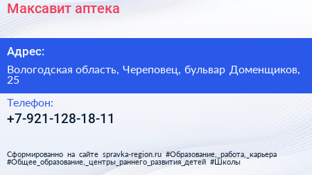 Максавит, аптека по адресу Вологодская область, Череповец, бульвар Доменщиков, 25 в дальнейшем Организация, размещена в следующих категориях: