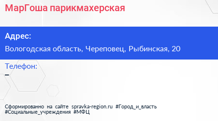 МарГоша, парикмахерская по адресу Вологодская область, Череповец, Рыбинская, 20 в дальнейшем Организация, размещена в следующих категориях: