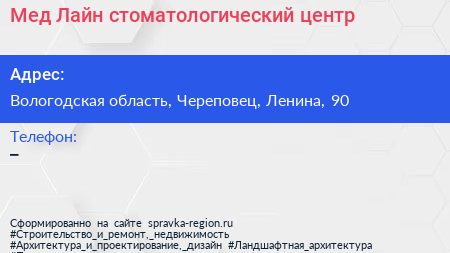 Мед Лайн, стоматологический центр по адресу Вологодская область, Череповец, Ленина, 90 в дальнейшем Организация, размещена в следующих категориях: