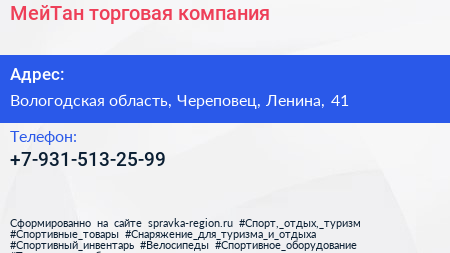 МейТан, торговая компания по адресу Вологодская область, Череповец, Ленина, 41 в дальнейшем Организация, размещена в следующих категориях: