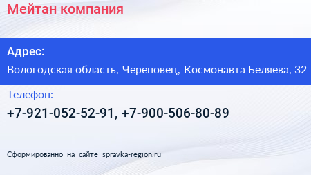 Мейтан, компания по адресу Вологодская область, Череповец, Космонавта Беляева, 32 в дальнейшем Организация, размещена в следующих категориях: