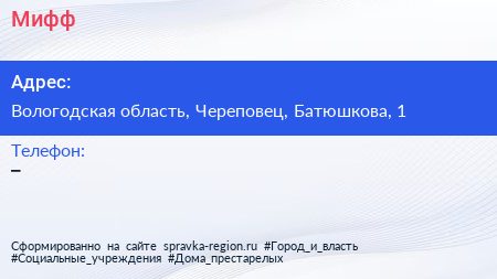 Мифф по адресу Вологодская область, Череповец, Батюшкова, 1 в дальнейшем Организация, размещена в следующих категориях: