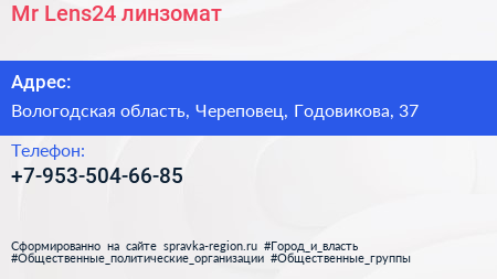 Mr.Lens24, линзомат по адресу Вологодская область, Череповец, Годовикова, 37 в дальнейшем Организация, размещена в следующих категориях: