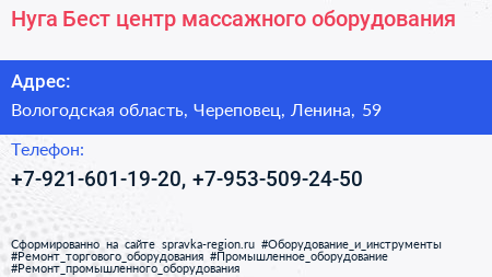 Нуга Бест, центр массажного оборудования по адресу Вологодская область, Череповец, Ленина, 59 в дальнейшем Организация, размещена в следующих категориях: