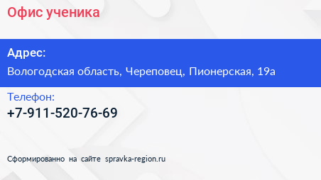 Офис ученика по адресу Вологодская область, Череповец, Пионерская, 19а в дальнейшем Организация, размещена в следующих категориях: