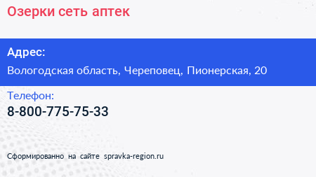 Озерки, сеть аптек по адресу Вологодская область, Череповец, Пионерская, 20 в дальнейшем Организация, размещена в следующих категориях: