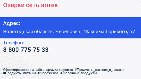 Озерки, сеть аптек по адресу Вологодская область, Череповец, Максима Горького, 57 в дальнейшем Организация, размещена в следующих категориях: