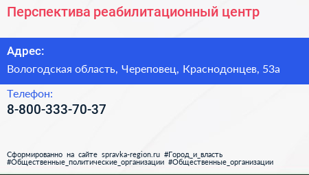 Перспектива, реабилитационный центр по адресу Вологодская область, Череповец, Краснодонцев, 53а в дальнейшем Организация, размещена в следующих категориях: