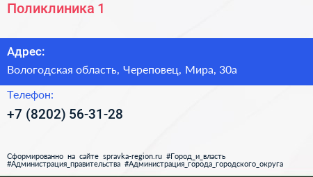 Поликлиника №1 по адресу Вологодская область, Череповец, Мира, 30а в дальнейшем Организация, размещена в следующих категориях: