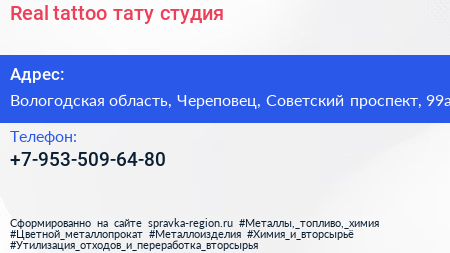 Real tattoo, тату-студия по адресу Вологодская область, Череповец, Советский проспект, 99а в дальнейшем Организация, размещена в следующих категориях: