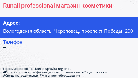 Runail professional, магазин косметики по адресу Вологодская область, Череповец, проспект Победы, 200 в дальнейшем Организация, размещена в следующих категориях: