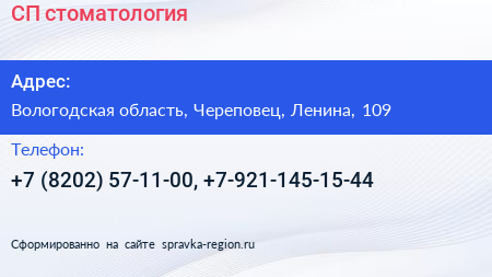 СП, стоматология по адресу Вологодская область, Череповец, Ленина, 109 в дальнейшем Организация, размещена в следующих категориях: