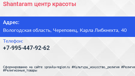 Shantaram, центр красоты по адресу Вологодская область, Череповец, Карла Либкнехта, 40 в дальнейшем Организация, размещена в следующих категориях: