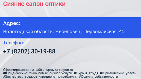 Сияние, салон оптики по адресу Вологодская область, Череповец, Первомайская, 45 в дальнейшем Организация, размещена в следующих категориях: