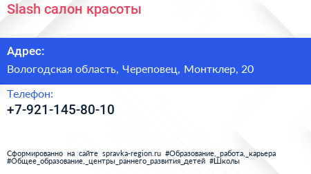 Slash, салон красоты по адресу Вологодская область, Череповец, Монтклер, 20 в дальнейшем Организация, размещена в следующих категориях: