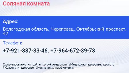 Соляная комната по адресу Вологодская область, Череповец, Октябрьский проспект, 42 в дальнейшем Организация, размещена в следующих категориях: