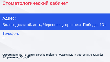 Стоматологический кабинет по адресу Вологодская область, Череповец, проспект Победы, 131 в дальнейшем Организация, размещена в следующих категориях: