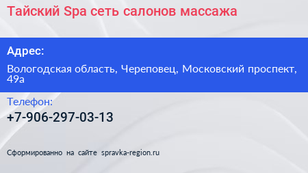 Тайский Spa, сеть салонов массажа по адресу Вологодская область, Череповец, Московский проспект, 49а в дальнейшем Организация, размещена в следующих категориях: