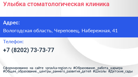 Улыбка, стоматологическая клиника по адресу Вологодская область, Череповец, Набережная, 41 в дальнейшем Организация, размещена в следующих категориях: