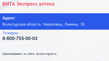 ВИТА Экспресс, аптека по адресу Вологодская область, Череповец, Ленина, 76 в дальнейшем Организация, размещена в следующих категориях: