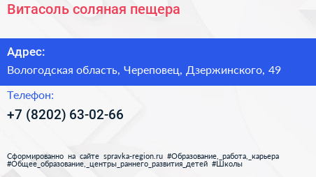 Витасоль, соляная пещера по адресу Вологодская область, Череповец, Дзержинского, 49 в дальнейшем Организация, размещена в следующих категориях: