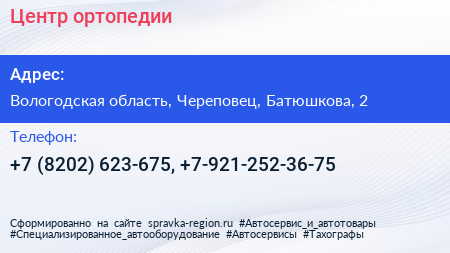 Центр ортопедии по адресу Вологодская область, Череповец, Батюшкова, 2 в дальнейшем Организация, размещена в следующих категориях: