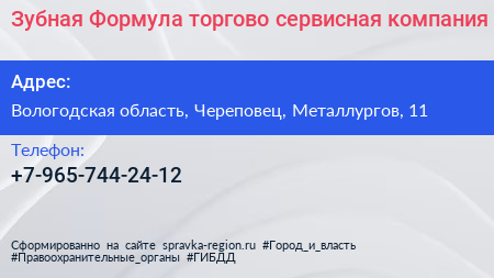 Зубная Формула, торгово-сервисная компания по адресу Вологодская область, Череповец, Металлургов, 11 в дальнейшем Организация, размещена в следующих категориях: