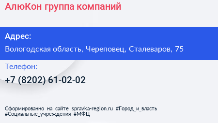 АлюКон, группа компаний по адресу Вологодская область, Череповец, Сталеваров, 75 в дальнейшем Организация, размещена в следующих категориях: