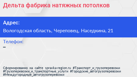 Дельта, фабрика натяжных потолков по адресу Вологодская область, Череповец, Наседкина, 21 в дальнейшем Организация, размещена в следующих категориях: