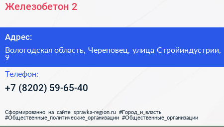 Железобетон-2 по адресу Вологодская область, Череповец, улица Стройиндустрии, 9 в дальнейшем Организация, размещена в следующих категориях:
