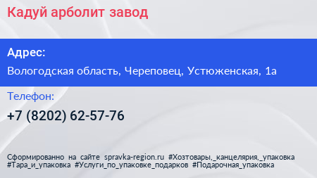 Кадуй арболит, завод по адресу Вологодская область, Череповец, Устюженская, 1а в дальнейшем Организация, размещена в следующих категориях: