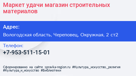 Маркет удачи, магазин строительных материалов по адресу Вологодская область, Череповец, Окружная, 2 ст2 в дальнейшем Организация, размещена в следующих категориях: