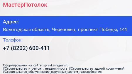 МастерПотолок по адресу Вологодская область, Череповец, проспект Победы, 141 в дальнейшем Организация, размещена в следующих категориях: