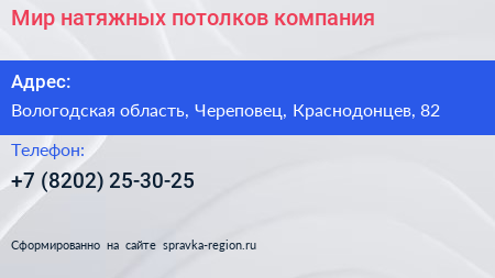 Мир натяжных потолков, компания по адресу Вологодская область, Череповец, Краснодонцев, 82 в дальнейшем Организация, размещена в следующих категориях: