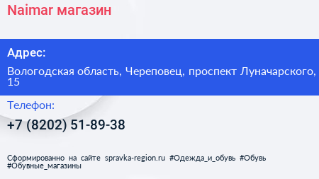 Naimar, магазин по адресу Вологодская область, Череповец, проспект Луначарского, 15 в дальнейшем Организация, размещена в следующих категориях:
