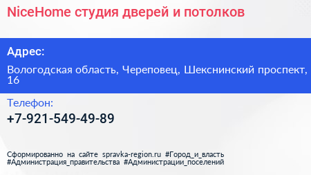 NiceHome, студия дверей и потолков по адресу Вологодская область, Череповец, Шекснинский проспект, 16 в дальнейшем Организация, размещена в следующих категориях: