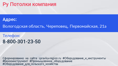 Ру Потолки, компания по адресу Вологодская область, Череповец, Первомайская, 21а в дальнейшем Организация, размещена в следующих категориях: