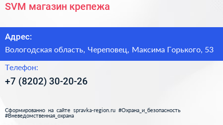 SVM, магазин крепежа по адресу Вологодская область, Череповец, Максима Горького, 53 в дальнейшем Организация, размещена в следующих категориях: